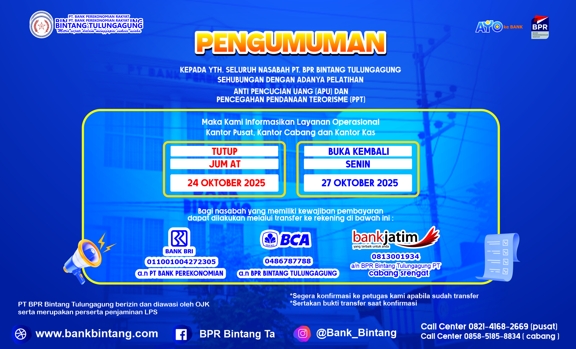 Sehubungan dengan adanya kegiatan pelatihan internal yang akan dilaksanakan oleh PT BPR Bintang Tulungagung, kami informasikan bah...